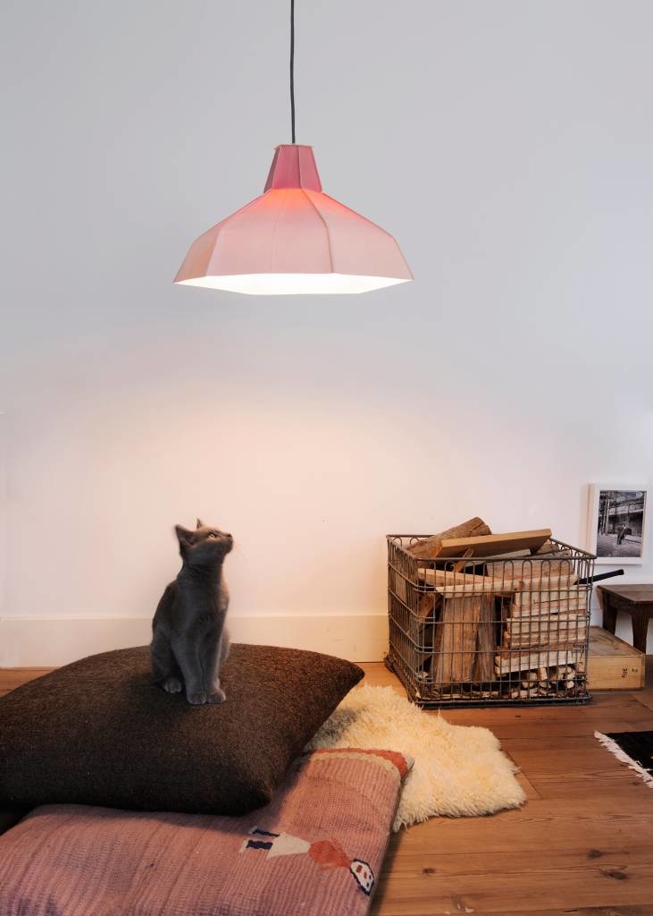 Simplicity meets sophistication in this folded lampshade original. Its innovative design allows a flat folded paper construction to unfold like a flower into a beautiful lampshade, which can be used with any hanging fixture. They are wonderful on their own but even more striking in a colorful group assembly.