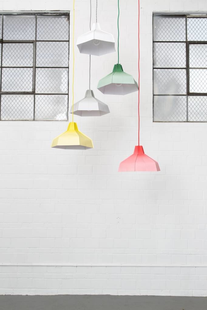 Simplicity meets sophistication in this folded lampshade original. Its innovative design allows a flat folded paper construction to unfold like a flower into a beautiful lampshade, which can be used with any hanging fixture. They are wonderful on their own but even more striking in a colorful group assembly.