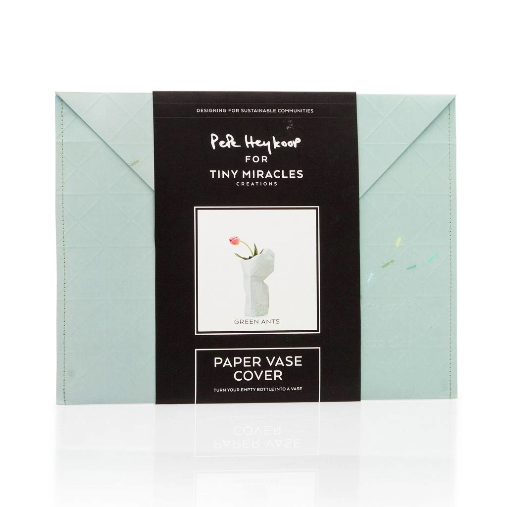 Empty bottles can literally be found anywhere in the world; from well-off and developed areas to impoverished city slums. And they can hold their water, making it an ideal vase. The only thing needed to make it look pretty is a beautiful cover. Our paper vase covers are hand folded by the women of Tiny Miracles. Their unique triangular paper design ensures easy assembly in under a minute.