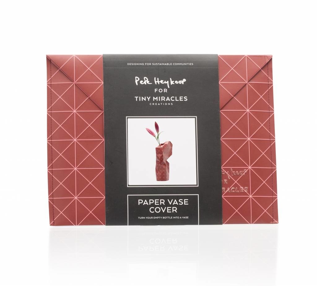 Empty bottles can literally be found anywhere in the world; from well-off and developed areas to impoverished city slums. And they can hold their water, making it an ideal vase. The only thing needed to make it look pretty is a beautiful cover. Our paper vase covers are hand folded by the women of Tiny Miracles. Their unique triangular paper design ensures easy assembly in under a minute.